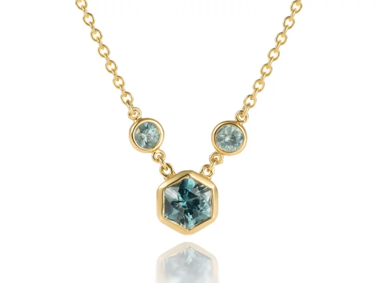 Gingko shaped gold earrings with dangling sapphire gemstone charms in the blues & greens of nature.
